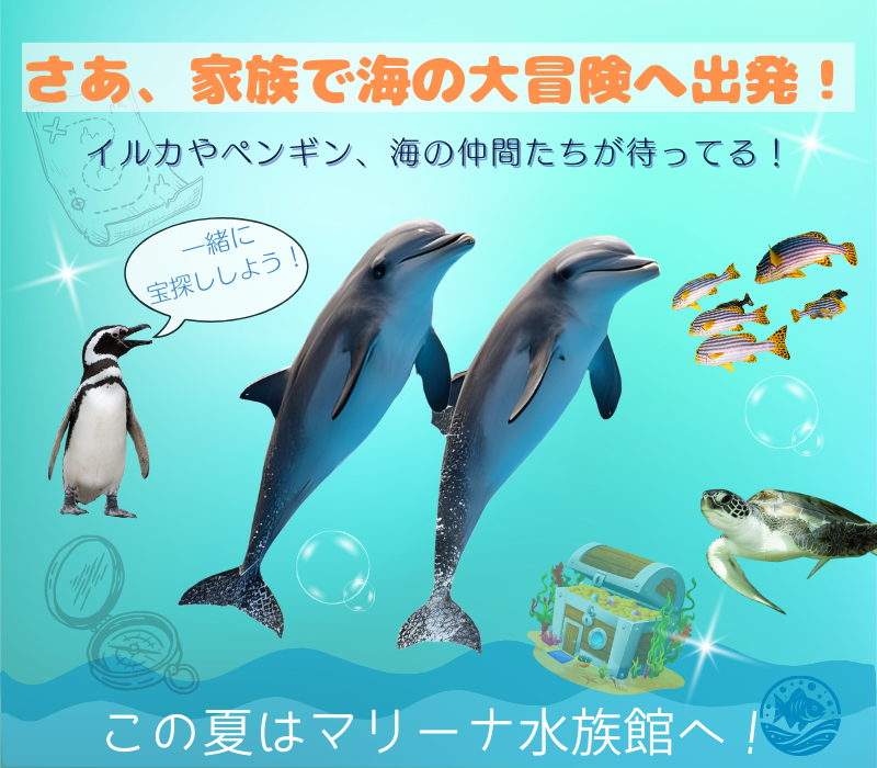 イルカやペンギンなどの人気の海洋生物を前面に出し、子どもから大人まで楽しめる施設であることをアピールしています。