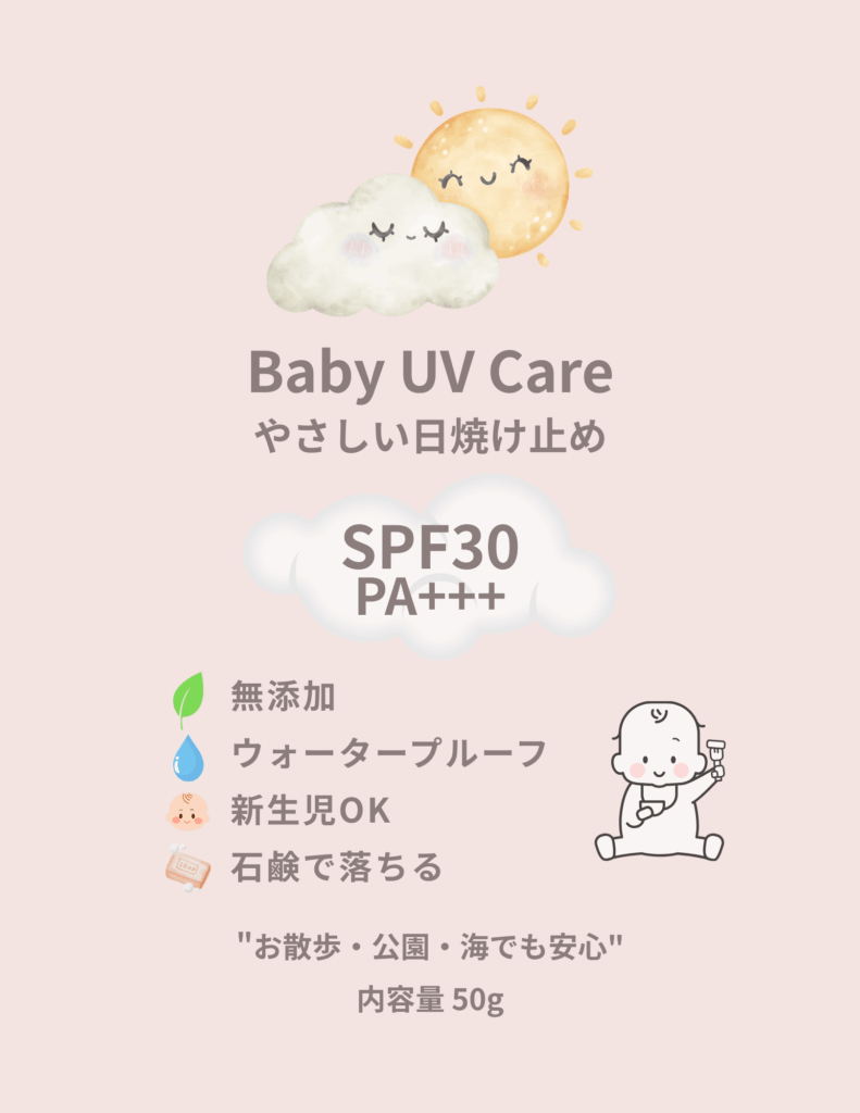 「やさしい日焼け止め」をテーマに、新生児から使える安心安全な日焼け止めのパッケージを制作しました。