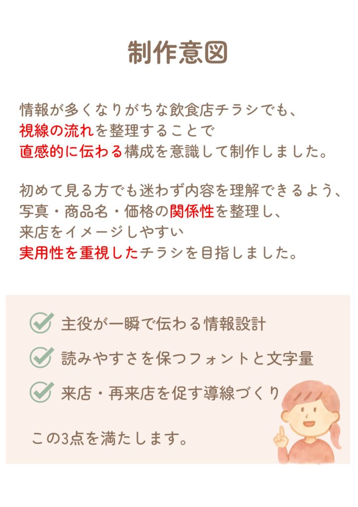 情報量の多い飲食店チラシにおいても、視線の流れを整理することで、商品の魅力と必要な情報が直感的に伝わる構成を意識して制作しました。