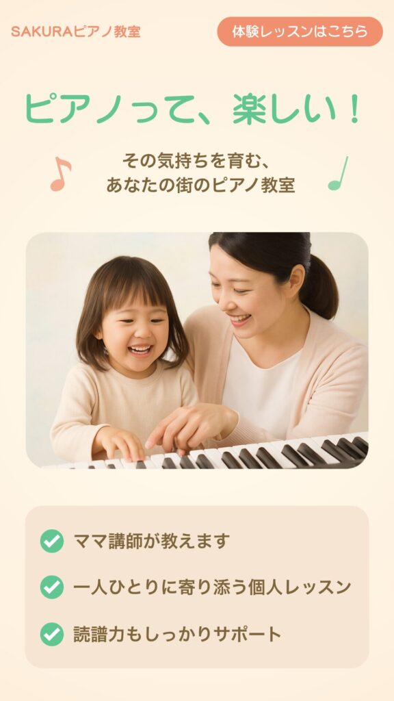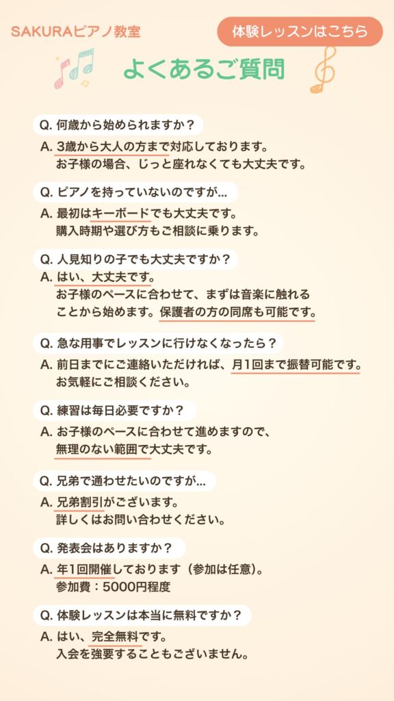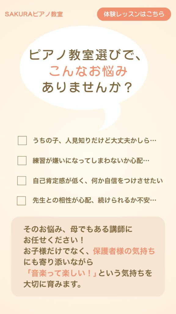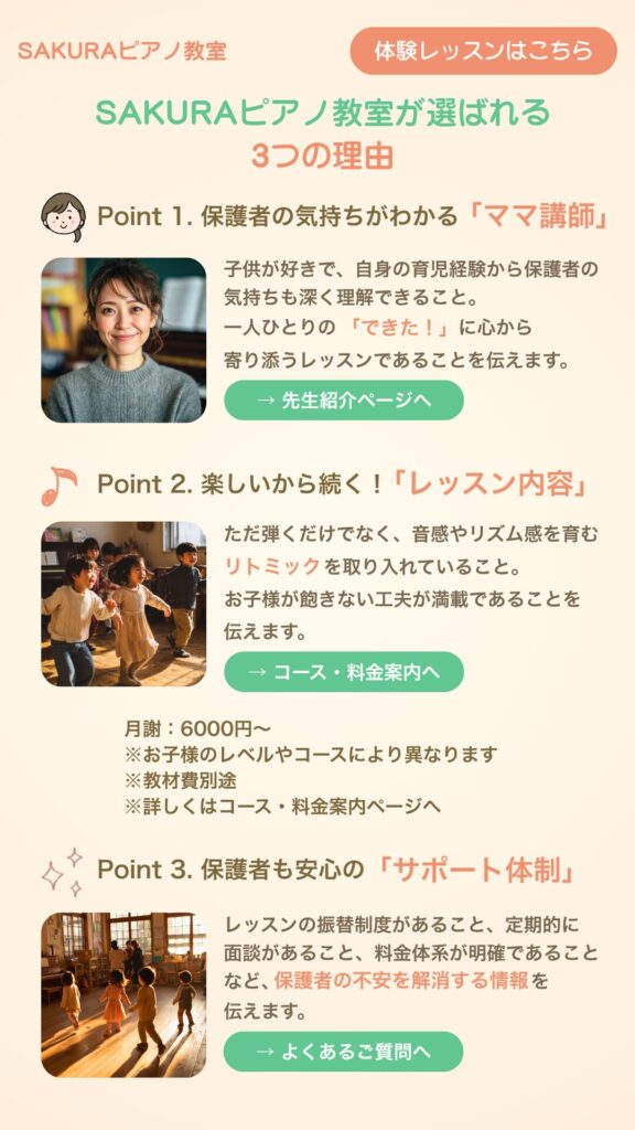 保護者の不安に寄り添い、「音楽って楽しい!」という気持ちを大切にする教室の想いを表現しています。
